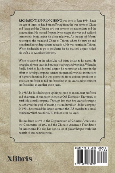 Richard Tien-Ren Cheng was born in June 1934. Since the age of three, he had been suffering from the war between China and Japan and the Chinese civil war between the nationalists and the communists. He moved frequently to escape the war and suffered immensely from losing his close relatives. At the age of fifteen, he escaped the mainland China to Taiwan, where he grew up and completed his undergraduate education. He was married in Taiwan. When he decided to go to the States for his master's degree, he left his wife, a son, and another son. When he arrived at the school, he had thirty dollars to his name. He struggled for ten years in between studying and working. When he finally finished his doctoral degree, he became an educator in the effort to develop computer science programs for various institutions of higher education. He was promoted from assistant professor to associate professor to full professorship in six years and to eminent professorship in another three years. In 1985, he decided to give up his position as an eminent professor and chairman of computer science at Old Dominion University to establish a small company. Through less than five years of struggle, he achieved the goal of making it a multimillion-dollar company. In 1991, he received the largest contract the IRS awarded to a small company, which was for $240 million over six years. He has been active in the Organization of Chinese Americans, the Committee of 100, and the Chinese-American Foundation for Americans. He also has done a lot of philanthropic work that benefit to several universities.