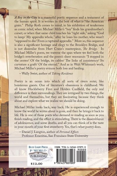 A Boy in the City is a masterful poetic sequence and a testament of the human spirit. It is written in the best of what is "the American grain." Philip Roth comes to mind, in his exhibition of tenderness as comic relief, when Michael Miller's "boy" finds his grandmother's corset; or when that same child touches his "right side," asking "God to keep/ My appendix whole," after he loses his mother, who wasn't "supposed to die/ From a ruptured appendix." More so, this sequence is also a significant homage and elegy to the Brooklyn Bridge, and is not dissimilar from Hart Crane's masterpiece, The Bridge. In Michael Miller's poem, we traverse the span where we feel both the bridge's reverberation and the poem's sheer resonance: "I stopped in the center/ Of the bridge, its cables/ The links of consistency/ Its curvature a graft/ Of the eternal." And as in Walt Whitman's work, Michael Miller's poetry evinces both loss and healing. - Wally Swist, author of Taking Residence Poetry is an ocean into which all sorts of rivers enter, like boisterous guests. One of literature's obsessions is childhood. We all know Huckleberry Finn and Holden Caulfield, the only real difference is their surroundings. They are intrigued by two things, the world and themselves, but they are fascinating because they think about and explore what we realize we should be doing. Michael Miller looks back, way back. He is experienced enough to know the world he writes about is gone, and then he brings it back to life. He is one of those poets who demand re-reading as soon as you finish reading, and the effect is stimulating. There is the dissemblance of adolescence, and some deaths, and all you can think of is the taste in your mouth of your first strawberry. Yes, that's what poetry does. - Daniel J. Langton, author of Personal Effects Professor Emeritus, San Francisco State University About the Author Michael Miller's poems have appeared in The Kenyon Review, The Sewanee Review,The Southern Review, Raritan, The Yale Review, and other journals and books. He lives in Amherst, Massachusetts.