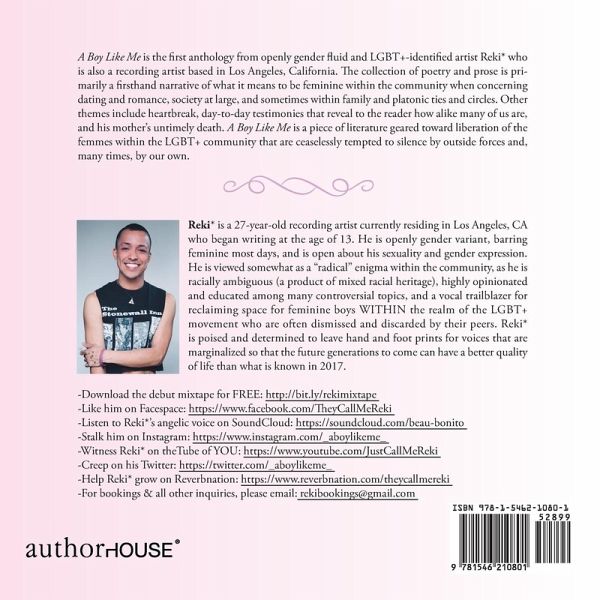 A Boy Like Me is the first anthology from openly gender fluid and LGBT+-identified artist Reki* who is also a recording artist based in Los Angeles, California. The collection of poetry and prose is primarily a firsthand narrative of what it means to be feminine within the community when concerning dating and romance, society at large, and sometimes within family and platonic ties and circles. Other themes include heartbreak, day-to-day testimonies that reveal to the reader how alike many of us are, and his mother's untimely death. A Boy Like Me is a piece of literature geared toward liberation of the femmes within the LGBT+ community that are ceaselessly tempted to silence by outside forces and, many times, by our own.