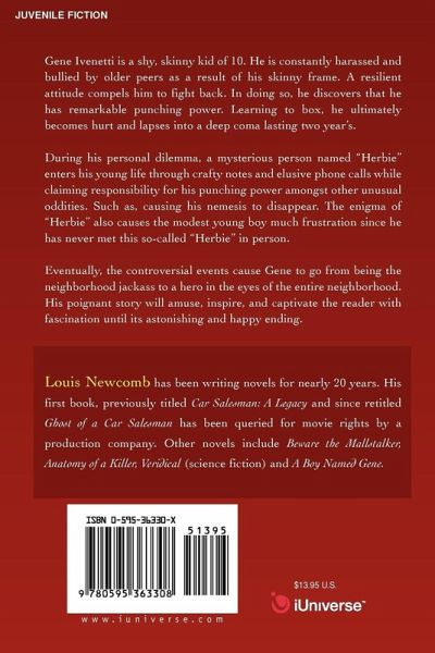 Gene Ivenetti is a shy, skinny kid of 10. He is constantly harassed and bullied by older peers as a result of his skinny frame. A resilient attitude compels him to fight back. In doing so, he discovers that he has remarkable punching power. Learning to box, he ultimately becomes hurt and lapses into a deep coma lasting two year's. During his personal dilemma, a mysterious person named 'Herbie" enters his young life through crafty notes and elusive phone calls while claiming responsibility for his punching power amongst other unusual oddities. Such as, causing his nemesis to disappear. The enigma of 'Herbie" also causes the modest young boy much frustration since he has never met this so-called 'Herbie" in person. Eventually, the controversial events cause Gene to go from being the neighborhood jackass to a hero in the eyes of the entire neighborhood. His poignant story will amuse, inspire, and captivate the reader with fascination until its astonishing and happy ending.
