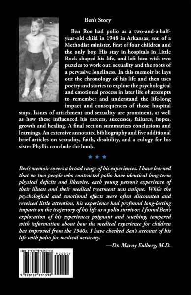 A Boy Survives shows what the human spirit can achieve. Surviving polio during a time when parents weren't allowed to see their kids in hospitals and disabilities weren't talked about, Ben Roe shares openly about how this early-life trauma affected his heart and relationships - and how he healed. He has written a moving and vulnerable account of surviving and of thriving throughout his journey with polio as a child and as an adult. He shares his experiences of isolation, detachment from family, resilience, and great hope. especially valuable for those in the post-polio community as well as nurses, chaplains, educators, and caregivers.