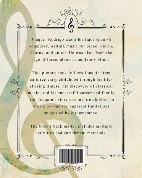 Joaquin Rodrigo was a brilliant Spanish composer, writing music for piano, violin, chorus, and guitar. He was also, from the age of three, almost completely blind. This picture book follows Joaquin from carefree early childhood through his life-altering illness, his discovery of classical music, and his successful career and family life. Joaquin's story can inspire children to dream beyond the apparent limitations suggested by circumstance. The book's back matter includes multiple activities and enrichment materials. "Splendid contribution to increasing the awareness of Joaquin Rodrigo's unbelievable life . . . . The illustrations are beautiful, but above all, the text is most appropriate and true." -- Cecilia Rodrigo, Director, Rodrigo Foundation