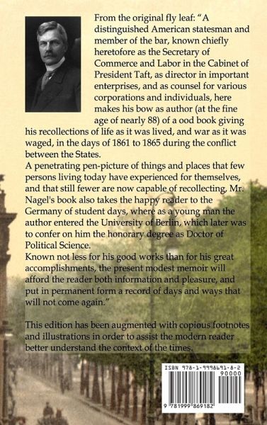 From the original fly leaf: "A distinguished American statesman and member of the bar, known chiefly heretofore as the Secretary of Commerce and Labor in the Cabinet of President Taft, as director in important enterprises, and as counsel for various corporations and individuals, here makes his bow as author (at the fine age of nearly 88) of a good book giving his recollections of life as it was lived, and war as it was waged, in the days of 1861 to 1865 during the conflict between the States. A penetrating pen-picture of things and places that few persons living today have experienced for themselves, and that still fewer are now capable of recollecting, Mr. Nagel's book also takes the happy reader to the Germany of student days, where as a young man the author entered the University of Berlin, which later was to confer on him the honorary degree as Doctor of Political Science. Known not less for his good works than for his great accomplishments, the present modest memoir will afford the reader both information and pleasure, and put in permanent form a record of days and ways that will not come again." This edition has been augmented with copious footnotes and illustrations to assist the modern reader to understand better the context of the time.