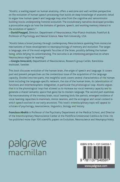 This book discusses evolution of the human brain, the origin of speech and language. It covers past and present perspectives on the contentious issue of the acquisition of the language capacity. Divided into two parts, this insightful work covers several characteristics of the human brain including the language-specific network, the size of the human brain, its lateralization of functions and interhemispheric integration, in particular the phonological loop. Aboitiz argues that it is the phonological loop that allowed us to increase our vocal memory capacity and to generate a shared semantic space that gave rise to modern language. The second part examines the neuroanatomy of the monkey brain, vocal learning birds like parrots, emergent evidence of vocal learning capacities in mammals, mirror neurons, and the ecological and social context in which speech evolved in our early ancestors. This book's interdisciplinary topic will appeal to scholars of psychology, neuroscience, linguistics, biology and history.