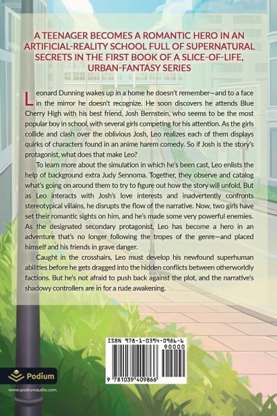 A teenager becomes a romantic hero in an artificial-reality school full of supernatural secrets in the first book of a slice-of-life, urban-fantasy series. Leonard Dunning wakes up in a home he doesn't remember-and to a face in the mirror he doesn't recognize. He soon discovers he attends Blue Cherry High with his best friend, Josh Bernstein, who seems to be the most popular boy in school, with several girls competing for his attention. As the girls collide and clash over the oblivious Josh, Leo realizes each of them displays quirks of characters found in an anime harem comedy. So if Josh is the story's protagonist, what does that make Leo? To learn more about the simulation in which he's been cast, Leo enlists the help of background extra Judy Sennoma. Together, they observe and catalog what's going on around them to try to figure out how the story will unfold. But as Leo interacts with Josh's love interests and inadvertently confronts stereotypical villains, he disrupts the flow of the narrative. Now, two girls have set their romantic sights on him, and he's made some very powerful enemies. As the designated secondary protagonist, Leo has become a hero in an adventure that's no longer following the tropes of the genre-and placed himself and his friends in grave danger. Caught in the crosshairs, Leo must develop his newfound superhuman abilities before he gets dragged into the hidden conflicts between otherworldly factions. But he's not afraid to push back against the plot, and the narrative's shadowy controllers are in for a rude awakening. The first volume of the hit slice-of-life romantic-comedy series-with more than two million views on Royal Road-now available on Audible and wherever ebooks are sold!