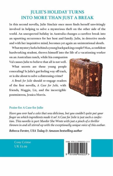 JULIE’S HOLIDAY TURNS INTO MORE THAN JUST A BREAK In this second novella, Julie Sinclair once more finds herself unwittingly involved in helping to solve a mysterious theft on the other side of the world. An unexpected holiday in Australia changes a carefree break into an upsetting occurrence for her host and family. Julie, in detective mode and with her inquisitive mind, becomes yet again an unintentional sleuth. What mystery lurks behind a young backpacking couple? Max, a confident hardworking student, throws himself into the life of a vacationing worker on an Australian ranch, while his companion Val causes Julie to believe that all is not well. What secrets are these young people concealing? Is Julie’s gut feeling way off track, or is she about to solve a distressing crime? A Break for Julie should re-engage readers of the first novella, A Case for Julie, with friends, Maggie, Liz, and the incorrigible postmistress, Jessica Morris.