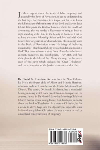 In these urgent times, the study of bible prophecy, and especially the Book of Revelation, is key to understanding the last days. As Christians, it is important for us to know the full measure of the ministry of our Lord and Savior, Jesus Christ. It began in the Book of Genesis, where the Lord God determined that we needed a Redeemer to bring us back to right standing with Him, in the beauty of holiness. That is, to have the same fellowship Adam and Eve had with God before their original sin of disobedience. His ministry ends in the Book of Revelation where He brings all believing mankind to "That beautiful city whose builder and maker is God." But those who turn away from Him--the unbelievers, corrupt, murderers, idol worshippers, --Rev 21:8, will find their place in the lake of fire. Along the way, the last seven years of this earth which includes the "Great Tribulation" and the redemption of the Jewish remnant, are described. Dr Daniel N. Harrison, Sr. was born in New Orleans, La. He is the fourth child of Albert and Minnie Harrison, who were dedicated members of the Divine Mission of God Church. The pastor, Dr Joseph St Martin, had a wonderful healing ministry which drew people from various parts of the country. In was in Dr Martin's Saturday Morning Children's Church Service where young Daniel first developed curiosity about the Book of Revelation. As a mature Christian, he felt a desire to delve deep into the Apocalypse, especially since he found many fellow Christians did not attempt to read or understand this great book of prophecy.