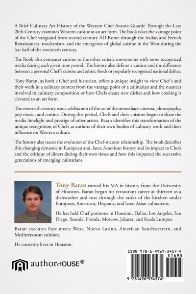 A Brief Culinary Art History of the Western Chef Avante-Guarde Through the Late 20th Century examines Western cuisine as an art form. The book takes the vantage point of the Chef vanguard from second century AD Rome through the Italian and French Renaissances, modernism, and the emergence of global cuisine in the West during the last half of the twentieth century. The Book also compares cuisine to the other artistic movements with more recognized media during each given time period. The history also defines a cuisine and the difference between a personal Chef's cuisine and ethnic foods or popularly recognized national dishes. Tony Baran, as both a Chef and historian, offers a unique insight to view Chef's and their work in a culinary context from the vantage point of a culinarian and the nuances involved in culinary composition or how Chefs create new dishes and how cooking is elevated to an art form. The twentieth century was a celebration of the art of the immediate: cinema, photography, pop music, and cuisine. During this period, Chefs and their cuisines began to share the media limelight and prestige of other artists. Baran identifies this transformation of the unique recognition of Chefs as authors of their own bodies of culinary work and their influence on Western culture. The history also traces the evolution of the Chef-mentor relationship. The book describes this changing dynamic in European and, later, American history and its impact to Chefs and the critique of diners during their own times and how this impacted the successive generations of emerging culinarians.