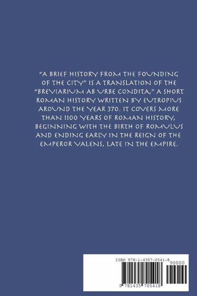 "A Brief History From the Founding of the City" is a translation of the "Breviarium Ab Urbe Condita," a short Roman history written by Eutropius around the year 370. It covers more than 1100 years of Roman history in less than a hundred pages, beginning with the birth of Romulus and ending early in the reign of the emperor Valens, late in the empire.