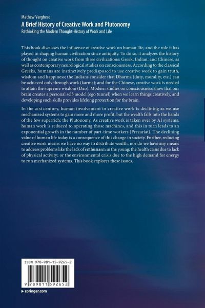 This book discusses the influence of creative work on human life, and the role it has played in shaping human civilization since antiquity. To do so, it analyzes the history of thought on creative work from three civilizations: Greek, Indian, and Chinese, as well as contemporary neurological studies on consciousness. According to the classical Greeks, humans are instinctively predisposed to use creative work to gain truth, wisdom and happiness; the Indians consider that Dharma (duty, morality, etc.) can be achieved only through work (karma); and for the Chinese, creative work is needed to attain the supreme wisdom (Dao). Modern studies on consciousness show that our brain creates a personal self-model (ego tunnel) when we learn things creatively, and developing such skills provides lifelong protection for the brain.
