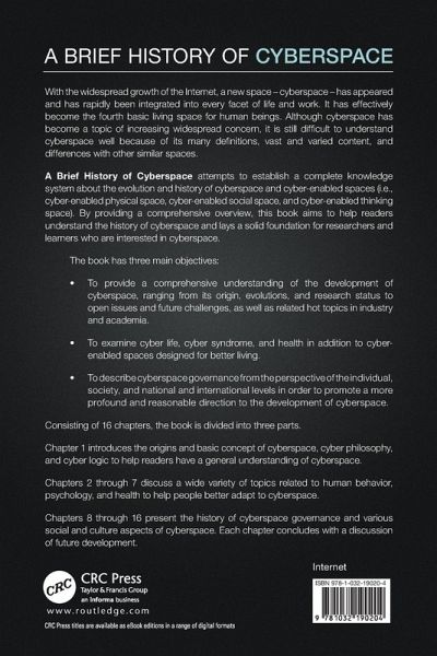 1. Cyberspace, Cyber Philosophy, and Cyberlogic 2. Cyberspace Behavior Development and Research History 3. History of Online Social Network 4. Research History on Cyber-Enabled Disease (Cyber Syndrome) 5. Cyborg: A Fusion System of Human and Electronic Machinery 6. The Brief History Digital Twin Research7. Psychology and Emotion Research History in Cyberspace 8. The History of Gender Research in Cyberspace 9. Taking a Glimpse through the Future of Cyberethics 10. Cyber-Religion: Past, Present, and Future 11. Cyberspace Culture and Art Research History 12. Cyberspace Sovereignty Development and Research History 13. Cyberspace Governance Coordination Mechanism 14. Cybercrime and Research History 15. A Brief History of Cyberspace Legislations 16. A Brief History of Cyber War