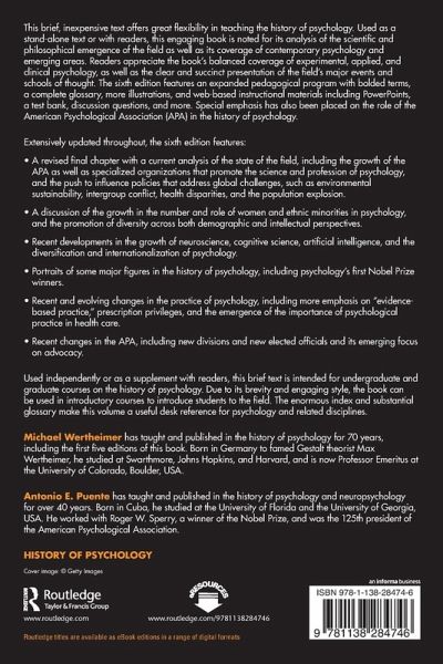 This brief, inexpensive text offers great flexibility in teaching the history of psychology. Used as a stand-alone text or with readers, this engaging book is noted for its analysis of the scientific and philosophical emergence of the field as well as its coverage of contemporary psychology and emerging areas. Readers appreciate the book's balanced coverage of experimental, applied, and clinical psychology, as well as the clear and succinct presentation of the field's major events and schools of thought. The sixth edition features an expanded pedagogical program with bolded terms, a complete glossary, more illustrations, and web-based instructional materials including PowerPoints, a test bank, discussion questions, and more. Special emphasis has also been placed on the role of the American Psychological Association (APA) in the history of psychology.