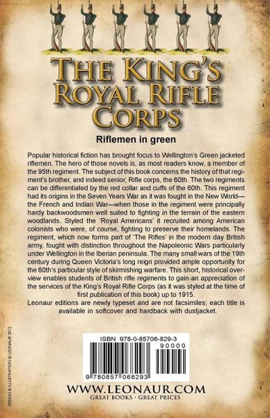 Riflemen in green Popular historical fiction has brought focus to Wellington's Green jacketed riflemen. The hero of those novels is, as most readers know, a member of the 95th regiment. The subject of this book concerns the history of that regiment's brother, and indeed senior, Rifle corps, the 60th. The two regiments can be differentiated by the red collar and cuffs of the 60th. This regiment had its origins in the Seven Years War as it was fought in the New World-the French and Indian War-when those in the regiment were principally hardy backwoodsmen well suited to fighting in the terrain of the eastern woodlands. Styled the 'Royal Americans' it recruited among American colonists who were, of course, fighting to preserve their homelands. The regiment, which now forms part of 'The Rifles' in the modern day British army, fought with distinction throughout the Napoleonic Wars particularly under Wellington in the Iberian peninsula. The many small wars of the 19th century during Queen Victoria's long reign provided ample opportunity for the 60th's particular style of skirmishing warfare. This short, historical overview enables students of British rifle regiments to gain an appreciation of the services of the King's Royal Rifle Corps (as it was styled at the time of first publication of this book) up to 1915. Leonaur editions are newly typeset and are not facsimiles; each title is available in softcover and hardback with dustjacket.