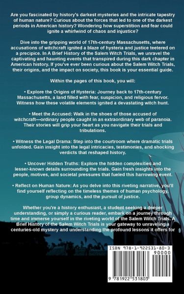 Are you fascinated by history's darkest mysteries and the intricate tapestry of human nature? Curious about the forces that led to one of the darkest periods in American history? Wondering how superstition and fear could ignite a whirlwind of chaos and injustice? Dive into the gripping world of 17th-century Massachusetts, where accusations of witchcraft ignited a blaze of hysteria and justice teetered on a precipice. In A Brief History of the Salem Witch Trials, we unravel the captivating and haunting events that transpired during this dark chapter in American history. If you've ever been curious about the Salem Witch Trials, their origins, and the impact on society, this book is your essential guide. Within the pages of this book, you will: Explore the Origins of Hysteria: Journey back to 17th-century Massachusetts, a land filled with fear, suspicion, and religious fervor. Witness how these volatile elements ignited a devastating witch hunt. Meet the Accused: Walk in the shoes of those accused of witchcraft-ordinary people caught in an extraordinary web of paranoia. Their stories will grip your heart as you navigate their trials and tribulations. Witness the Legal Drama: Step into the courtroom where dramatic trials unfolded. Gain insight into the legal intricacies, testimonies, and shocking verdicts that reshaped history. Uncover Hidden Truths: Explore the hidden complexities and lesser-known details surrounding the trials. Gain fresh insights into the people, motives, and societal pressures that fueled this harrowing event. Reflect on Human Nature: As you delve into this riveting narrative, you'll find yourself reflecting on the timeless themes of human psychology, group dynamics, and the pursuit of justice. Whether you're a history enthusiast, a student seeking a deeper understanding, or simply a curious reader, embark on a journey through time and immerse yourself in the riveting world of the Salem Witch Trials. A Brief History of the Salem Witch Trials is your gateway to unraveling a centuries-old mystery and understanding the profound lessons it offers for today's world. Get your copy now and be captivated by this compelling blend of history, intrigue, and human drama!