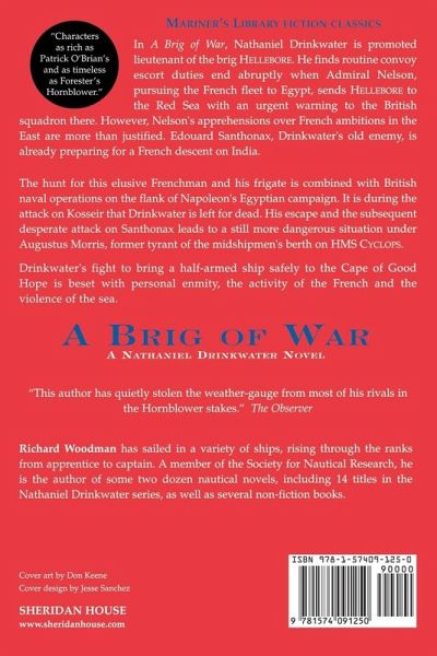 In A Brig of War, Nathaniel Drinkwater is promoted lieutenant of the brig Hellebore. He finds routine convoy escort duties end abruptly when Admiral Nelson, pursuing the French fleet to Egypt, sends Hellebore to the Red Sea with an urgent warning to the British squadron there. However, Nelson's apprehensions over French ambitions in the East are more than justified. Edouard Santhonax, Drinkwater's old enemy, is already preparing for a French descent on India. The hunt for this elusive Frenchman and his frigate is combined with British naval operations on the flank of Napoleon's Egyptian campaign. It is during the attack on Kosseir that Drinkwater is left for dead. His escape and the subsequent desperate attack on Santhonax leads to a still more dangerous situation under Augustus Morris, former tyrant of the midshipmen's berth on HMS Cyclops. Drinkwater's fight to bring a half-armed ship safely to the cape of Good Hope is beset with personal enmity, the activity of the French and the violence of the sea.