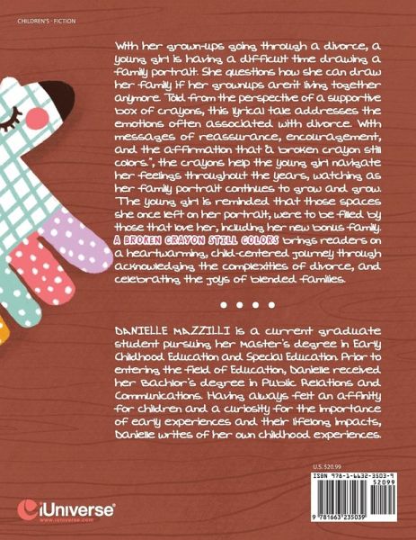 With her grown-ups going through a divorce, a young girl is having a difficult time drawing a family portrait. She questions how she can draw her family if her grown-ups aren't living together anymore. Told from the perspective of a supportive box of crayons, this lyrical tale addresses the emotions often associated with divorce. With messages of reassurance, encouragement, and the affirmation that "a broken crayon still colors," the crayons help the young girl navigate her feelings throughout the years, watching as her family portrait continues to grow and grow. The young girl is reminded that those spaces she once left on her portrait were to be filled by those that love her, including her new bonus family. A Broken Crayon Still Colors brings readers on a heartwarming, child-centered journey through acknowledging the complexities of divorce, and celebrating the joys of blended families.
