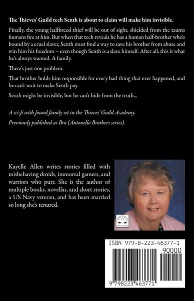 The Thieves' Guild tech Senth is about to claim will make him invisible. Finally, the young halfbreed thief will be out of sight, shielded from the taunts humans fire at him. But when that tech reveals he has a human half-brother who's bound by a cruel slaver, Senth must find a way to save his brother from abuse and win him his freedom -- even though Senth is a slave himself. After all, this is what he's always wanted. A family. There's just one problem. That brother holds him responsible for every bad thing that ever happened, and he can't wait to make Senth pay. Senth might be invisible, but he can't hide from the truth... A sci-fi with found family set in the Thieves' Guild Academy. Previously published as Bro (Antonello Brothers series).