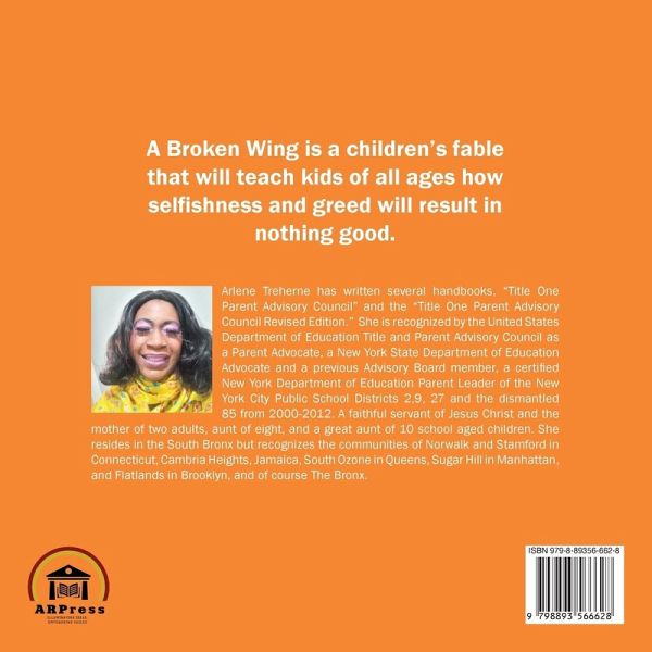 A Broken Wing is a children's fable that will teach kids of all ages how selfishness and greed will result in nothing good. Arlene Treherne has written several handbooks, "Title One Parent Advisory Council" and the "Title One Parent Advisory Council Revised Edition." She is recognized by the United States Department of Education Title and Parent Advisory Council as a Parent Advocate, a New York State Department of Education Advocate and a previous Advisory Board member, a certified New York Department of Education Parent Leader of the New York City Public School Districts 2,9, 27 and the dismantled 85 from 2000-2012. A faithful servant of Jesus Christ and the mother of two adults, aunt of eight, and a great aunt of 10 school aged children. She resides in the South Bronx but recognizes the communities of Norwalk and Stamford in Connecticut, Cambria Heights, Jamaica, South Ozone in Queens, Sugar Hill in Manhattan, and Flatlands in Brooklyn, and of course The Bronx.