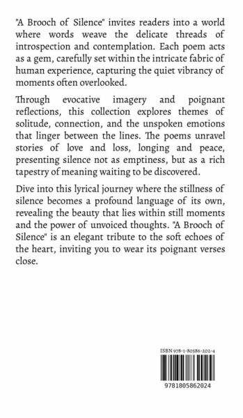 "A Brooch of Silence" invites readers into a world where words weave the delicate threads of introspection and contemplation. Each poem acts as a gem, carefully set within the intricate fabric of human experience, capturing the quiet vibrancy of moments often overlooked. Through evocative imagery and poignant reflections, this collection explores themes of solitude, connection, and the unspoken emotions that linger between the lines. The poems unravel stories of love and loss, longing and peace, presenting silence not as emptiness, but as a rich tapestry of meaning waiting to be discovered. Dive into this lyrical journey where the stillness of silence becomes a profound language of its own, revealing the beauty that lies within still moments and the power of unvoiced thoughts. "A Brooch of Silence" is an elegant tribute to the soft echoes of the heart, inviting you to wear its poignant verses close.