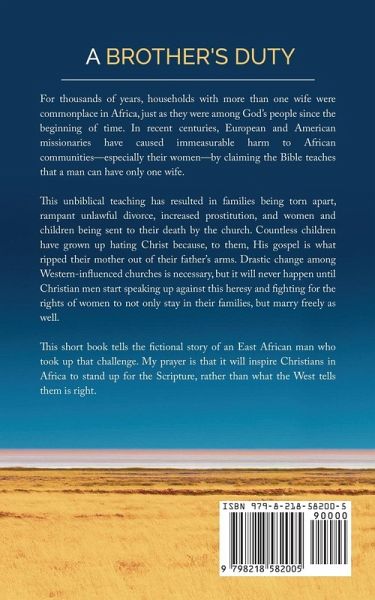 For thousands of years, households with more than one wife were commonplace in Africa, just as they were among God's people since the beginning of time. In recent centuries, European and American missionaries have caused immeasurable harm to African communities-especially their women-by claiming the Bible teaches that a man can have only one wife.This unbiblical teaching has resulted in families being torn apart, rampant unlawful divorce, increased prostitution, and women and children being sent to their death by the church. Countless children have grown up hating Christ because, to them, His gospel is what ripped their mother out of their father's arms. Drastic change among Western-influenced churches is necessary, but it will never happen until Christian men start speaking up against this heresy and fighting for the rights of women to not only stay in their families, but marry freely as well. This short book tells the fictional story of an East African man who took up that challenge. My prayer is that it will inspire Christians in Africa to stand up for the Scripture, rather than what the West tells them is right.This story is the sixth story in Polygamy: Six Short Stories About Christian Families Who Obeyed The Bible And Wound Up With Multiple Wives.