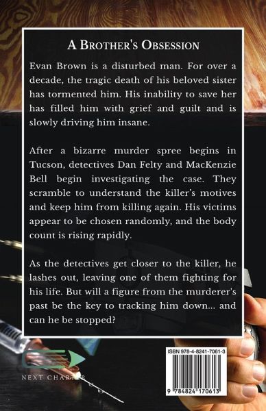 Evan Brown is a disturbed man. For over a decade, the tragic death of his beloved sister has tormented him. His inability to save her has filled him with grief and guilt and is slowly driving him insane. After a bizarre murder spree begins in Tucson, detectives Dan Felty and MacKenzie Bell begin investigating the case. They scramble to understand the killer's motives and keep him from killing again. His victims appear to be chosen randomly, and the body count is rising rapidly. As the detectives get closer to the killer, he lashes out, leaving one of them fighting for his life. But will a figure from the murderer's past be the key to tracking him down... and can he be stopped?