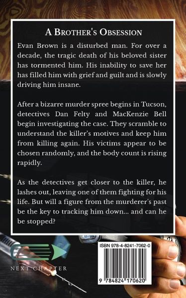 Evan Brown is a disturbed man. For over a decade, the tragic death of his beloved sister has tormented him. His inability to save her has filled him with grief and guilt and is slowly driving him insane. After a bizarre murder spree begins in Tucson, detectives Dan Felty and MacKenzie Bell begin investigating the case. They scramble to understand the killer's motives and keep him from killing again. His victims appear to be chosen randomly, and the body count is rising rapidly. As the detectives get closer to the killer, he lashes out, leaving one of them fighting for his life. But will a figure from the murderer's past be the key to tracking him down... and can he be stopped?