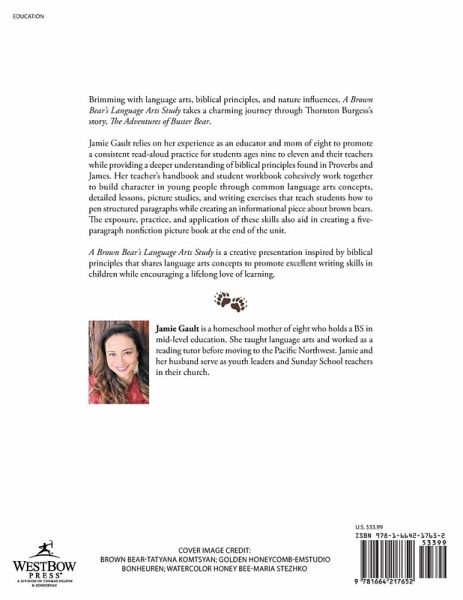 Brimming with language arts, biblical principles, and nature influences, A Brown Bear's Language Arts Study takes a charming journey through Thornton Burgess's story, The Adventures of Buster Bear. Jamie Gault relies on her experience as an educator and mom of eight to promote a consistent read-aloud practice for students ages nine to eleven and their teachers while providing a deeper understanding of biblical principles found in Proverbs and James. Her teacher's handbook and student workbook cohesively work together to build character in young people through common language arts concepts, detailed lessons, picture studies, and writing exercises that teach students how to pen structured paragraphs while creating an informational piece about brown bears. The exposure, practice, and application of these skills also aid in creating a five-paragraph nonfiction picture book at the end of the unit. A Brown Bear's Language Arts Study is a creative presentation inspired by biblical principles that shares language arts concepts to promote excellent writing skills in children while encouraging a lifelong love of learning.