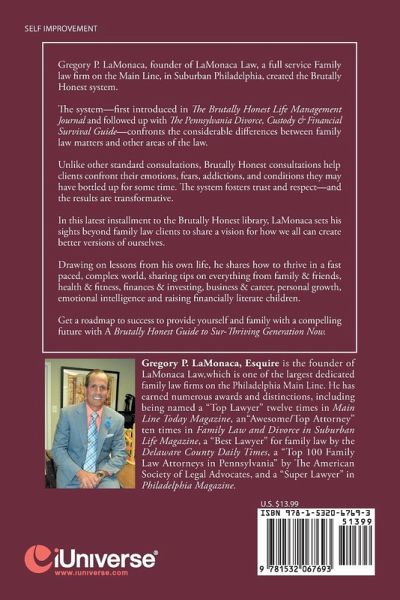 Gregory P. LaMonaca, founder of LaMonaca Law, a full service Family law firm on the Main Line, in Suburban Philadelphia, created the Brutally Honest system. The system-first introduced in The Brutally Honest Life Management Journal and followed up with The Pennsylvania Divorce, Custody & Financial Survival Guide-confronts the considerable differences between family law matters and other areas of the law. Unlike other standard consultations, Brutally Honest consultations help clients confront their emotions, fears, addictions, and conditions they may have bottled up for some time. The system fosters trust and respect-and the results are transformative. In this latest installment to the Brutally Honest library, LaMonaca sets his sights beyond family law clients to share a vision for how we all can create better versions of ourselves. Drawing on lessons from his own life, he shares how to thrive in a fast paced, complex world, sharing tips on everything from family & friends, health & fitness, finances & investing, business & career, personal growth, emotional intelligence and raising financially literate children. Get a roadmap to success to provide yourself and family with a compelling future with A Brutally Honest Guide to Sur-Thriving Generation Now.