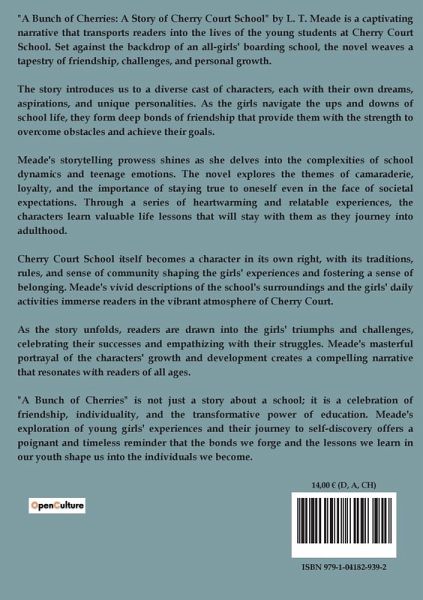 "A Bunch of Cherries" by L. T. Meade is a captivating story set in the late 19th century at Cherry Court School, a prestigious institution for young girls. The narrative revolves around the lives of the students, particularly focusing on Kitty Sharston, a spirited and determined girl facing significant challenges. The school, known for its high standards in education and deportment, becomes the backdrop for a fierce competition when Sir John Wallis, a benefactor of the school, announces a Scholarship prize. This prize promises three years of free education to the girl who excels in conduct, deportment, and academics. Kitty, whose father, Major Sharston, is forced to leave for India due to financial difficulties, sees this Scholarship as her only hope to avoid living with a distant cousin she despises. The story delves into the dynamics between the students, highlighting themes of friendship, rivalry, and the pursuit of excellence. Florence Aylmer, another student, grapples with her own changes and the moral dilemma of competing against Kitty, who needs the Scholarship more desperately. As the Cherry Feast approaches, the preliminary test for the Scholarship looms large, and the girls are driven by their individual motivations. The narrative beautifully captures the essence of youthful determination and the complexities of growing up, set against the charming and disciplined environment of Cherry Court School.