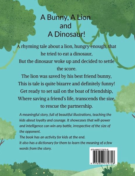 A Bunny, A Lion and A Dinosaur! A rhyming tale about a lion, hungry enough, that he tried to eat a dinosaur, But the dinosaur woke up and decided to settle the score. The lion was saved by his best friend bunny, This is tale is quite bizarre and definitely funny! Get ready to set sail on the boat of friendship, Where saving a friend's life, transcends the size, to rescue the partnership. A meaningful story, full of beautiful illustrations, teaching the kids about loyalty and courage. It showcases that willpower and intelligence can win any battle, irrespective of the size of the opponent. The book has an activity for kids at the end. It also has a dictionary for them to learn the meaning of a few words from the story.