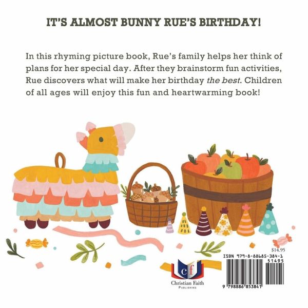 IT'S ALMOST BUNNY RUE'S BIRTHDAY! In this rhyming picture book, Rue's family helps her think of plans for her special day. After they brainstorm fun activities, Rue discovers what will make her birthday the best. Children of all ages will enjoy this fun and heartwarming book!