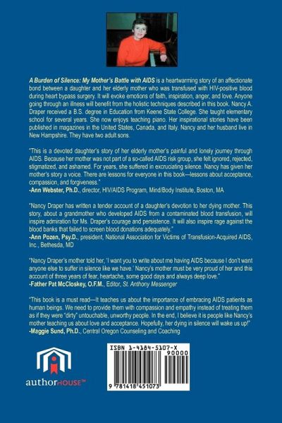 A Burden of Silence: My Mother's Battle with AIDS, is a heartwarming story of an affectionate bond between a daughter and her sixty-six year old mother who was transfused with HIV positive blood during heart bypass surgery. It will evoke emotions of faith, inspiration, anger, and overwhelming love. The reader will also smile at the funny, tender moments that Ms. Draper writes about in her story. "This is a devoted daughter's story of her elderly mother's painful and lonely journey through AIDS. Because her mother was not part of a so-called AIDS risk group, she felt ignored, rejected, stigmatized, and ashamed. For years, she suffered in excruciating silence. Nancy has given her mother's story a voice. There are lessons for everyone in this book-lessons about acceptance, compassion, and forgiveness." -Ann Webster, Ph.D., director, HIV/AIDS Program, Mind/Body Institute, Boston, MA "Nancy Draper has written a tender account of a daughter's devotion to her dying mother. This story about a grandmother who developed AIDS from a contaminated blood transfusion, will inspire admiration for Ms. Draper's courage and persistence. It will also inspire rage against the blood banks that failed to screen blood donations adequately." -Ann Pozen, Psy.D., president, National Association for Victims of Transfusion-Acquired AIDS, Inc., Bethesda, MD "This book is a must read-It teaches us about the importance of embracing AIDS patients as human beings. We need to provide them with compassion and empathy instead of treating them as if they were "dirty" untouchable, unworthy people. In the end, I believe it is people like Nancy's mother teaching us about love and acceptance. Hopefully, her dying in silence will wake us up!" -Maggie Sund, Ph.D., Central Oregon Counseling and Coaching "Nancy Draper's mother told her, 'I want you to write about me having AIDS because I don't want anyone else to suffer in silence like we have.' Nancy's mother must be very proud of her and this account of three years of fear, heartache, some good days and always deep love. Here Nancy tells the rest of a story that she summarized in our March 1999 issue and wrote under a pseudonym. Thanks, Nancy!" -Father Pat McCloskey, O.F.M., Editor, St. Anthony Messenger