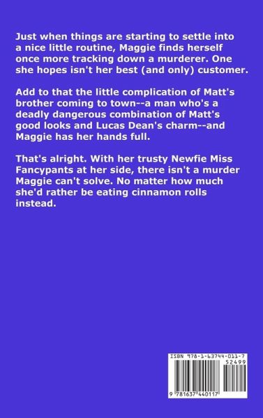 Just when things are starting to settle into a nice little routine, Maggie finds herself once more tracking down a murderer. One she hopes isn't her best (and only) customer. Add to that the little complication of Matt's brother coming to town--a man who's a deadly dangerous combination of Matt's good looks and Lucas Dean's charm-and Maggie has her hands full. That's alright. With her trusty Newfie Miss Fancypants at her side, there isn't a murder Maggie can't solve. No matter how much she'd rather be eating cinnamon rolls instead. This is a large print edition created using Verdana 16 pt font. All page numbers and titles are located on the outer corner of the page. Chapter headings and paragraphs are left-justified using a ragged right margin so that all words and letters are evenly spaced. All italics have been replaced with bolded text. There is also extra spacing between lines and paragraphs and no paragraph starts or ends with a single line on a different page. This book is also printed on cream-colored paper and with a matte cover to reduce glare. It is a hard cover version, but does not have a dust jacket.