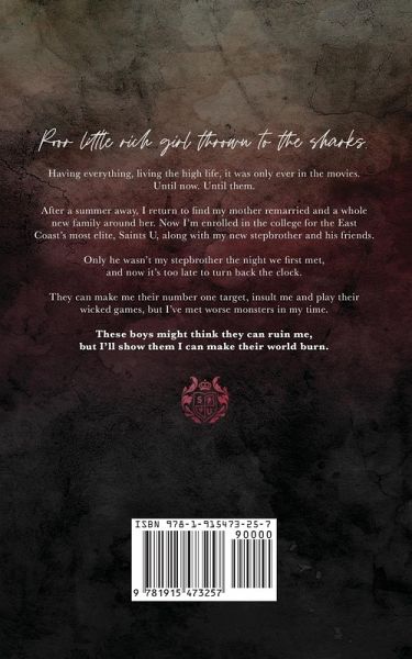 Poor little rich girl thrown to the sharks. Having everything, living the high life, it was only ever in the movies. Until now. Until them. After a summer away, I return to find my mother remarried and a whole new family around her. Now I'm enrolled in the college for the East Coast's most elite, Saints U, along with my new stepbrother and his friends. Only he wasn't my stepbrother the night we first met, and now it's too late to turn back the clock. They can make me their number one target, insult me and play their wicked games, but I've met worse monsters in my time. These boys might think they can ruin me, but I'll show them I can make their world burn.