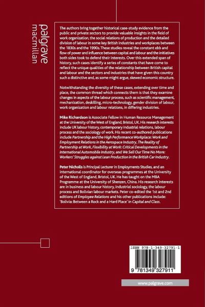 Introduction: Themes and Historical Backdrop; M.Richardson & P.Nicholls Labour, Management and Control: the Early Railway Industry in Britain; P.Nicholls Women, Mechanization and Cost-Savings in Twentieth-Century British Banks and other Financial Institutions; P.Wardley Bliss Tweed Mill Strike 1913-14: Causes, Conduct and Consequences; M.Richardson Rapprochement and Retribution: the Divergent Experiences of Workers in Two Large Paper and Print Companies in the 1926 General Strike; M.Richardson Work Relations: Compositors' Experiences in a Family-Owned Printing Company, J.W. Arrowsmith 1918-1939; M.Richardson Organisation, Ideology and Control: Founding Principles: the Case of the BBC; P.Nicholls Taylorism in the Mines? Technology, Work Organization and Management in British Coal-mining before Nationalization; S.Tailby Shop-floor Bargaining and the Struggle for Job Control in the British Automobile and Aerospace Industries 1950-1982; M.Richardson, P.Stewart & A.Danford