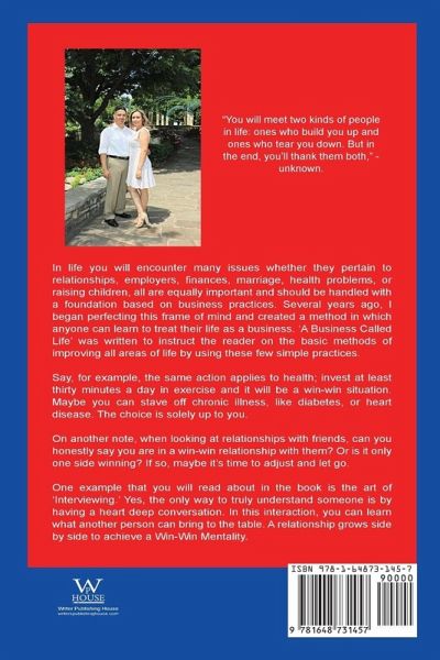 "You will meet two kinds of people in life: ones who build you up and ones who tear you down. But in the end, you'll thank them both," - unknown. In life you will encounter many issues whether they pertain to relationships, employers, finances, marriage, health problems, or raising children, all are equally important and should be handled with a foundation based on business practices. Several years ago, I began perfecting this frame of mind and created a method in which anyone can learn to treat their life as a business. 'A Business Called Life' was written to instruct the reader on the basic methods of improving all areas of life by using these few simple practices. Say, for example, the same action applies to health; invest at least thirty minutes a day in exercise and it will be a win-win situation. Maybe you can stave off chronic illness, like diabetes, or heart disease. The choice is solely up to you. On another note, when looking at relationships with friends, can you honestly say you are in a win-win relationship with them? Or is it only one side winning? If so, maybe it's time to adjust and let go. One example that you will read about in the book is the art of 'Interviewing.' Yes, the only way to truly understand someone is by having a heart deep conversation. In this interaction, you can learn what another person can bring to the table. A relationship grows side by side to achieve a Win-Win Mentality.