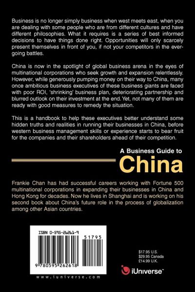 Business is no longer simply business when west meets east, when you are dealing with some people who are from different cultures and have different philosophies. What it requires is a series of best informed decisions to have things done right. Opportunities will only scarcely present themselves in front of you, if not your competitors in the ever-going battles. China is now in the spotlight of global business arena in the eyes of multinational corporations who seek growth and expansion relentlessly. However, while generously pumping money on their way to China, many once ambitious business executives of these business giants are faced with poor ROI, 'shrinking' business plan, deteriorating partnership and blurred outlook on their investment at the end. Yet, not many of them are ready with good measures to remedy the situation. This is a handbook to help these executives better understand some hidden truths and realities in running their businesses in China, before western business management skills or experience starts to bear fruit for the companies and their shareholders ahead of their competition.