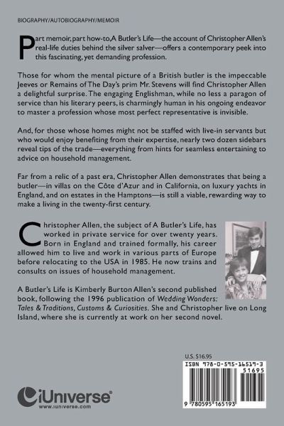 Part memoir, part how-to, A Butler's Life -- the account of Christopher Allen's real-life duties Behind The Silver Salver-- offers a contemporary peek into this fascinating, yet demanding profession. Those for whom the mental picture of a British butler is the impeccable Jeeves or Remains of the Day's prim Mr. Stevens will find Christopher Allen a surprise and a delight. The engaging Englishman, while no less a paragon of service than his literary peers, is charmingly human in his ongoing endeavor to master a profession whose most perfect representative is invisible. And, for those whose homes might not be staffed with live-in servants but who would enjoy benefiting from their expertise, nearly two dozen sidebars reveal tips of the trade--everything from hints for seamless entertaining to advice on household management. Far from a relic of a past era, Christopher Allen demonstrates that being a butler -- in villas on the Cote d'Azur and in California, on luxury yachts in England and estates in the Hamptons -- is still a very viable, rewarding way to make a living in the twenty-first century.