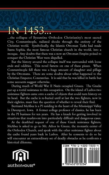 In 1453 the collapse of Byzantine Orthodox Christianity's most sacred City, Constantinople, radiated shocks through the entirety of the Christian world. Symbolically, the Islamic Ottoman Turks had made Santa Sophia, the most famous Christian church in the world, into a mosque. Any doubts that there was a now an Ottoman Empire poised to conquer the Christian West were dispelled. But the history around the collapse itself was surrounded with loose ends and oddities. This novel fastens on one of these pieces. When Constantinople fell there was a huge amount of slaughter and pillage by the Ottomans. There are some doubts about what happened to the Christian Emperor, Constantius. It is said that he was killed in battle but some accounts suggest otherwise. During much of World War II Nazis occupied Greece. The Greeks put up a torrid resistance to this occupation. On the island of Lesbos two resistance fighters came onto a cache of objects that could turn history on its head. But the cache is re-buried until at last the two fighters, now in their eighties, must face the question of whether to reveal their find. Bertrand McAbee is a PI residing in the heart of the Mississippi Valley in Davenport, Iowa. A former college professor of classics, he has been in the PI business for ten years. He has a knack for getting involved in situations that mushroom into particularly difficult and dangerous cases. At the deathbed request of one of these Greek resistance fighters, McAbee is asked to go to Mt. Athos in Greece, the monastic center of the Orthodox Church, and speak with the other resistance fighter about the cache found years back in Lesbos. After he consents to do so he will encounter an extraordinary set of deadly obstacles as he confronts a historical dilemma.