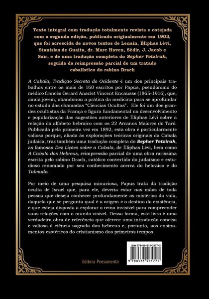 A Cabala, Tradição Secreta do Ocidente é um dos principais trabalhos entre os mais de 160 escritos por Papus. Publicada pela primeira vez em 1892, esta obra é particularmente valiosa porque, aliada às explorações teóricas originais da Cabala judaica, traz também uma tradução completa do Sepher Yetzirah, as famosas Dez Lições sobre a Cabala, de Éliphas Lévi, bem como A Cabala dos Hebreus, reimpressão parcial de uma obra raríssima escrita pelo rabino Drach, católico convertido do judaísmo e estudioso renomado por seu conhecimento acerca do hebraico e do Talmude. Por meio de uma pesquisa minuciosa, Papus trata da tradição oculta de Israel que, para ele, deveria estar nas mãos de toda pessoa que deseja conhecer profundamente os mistérios da vida, daquela que se pergunta qual é a origem e o destino da existência, e que esteja disposta a explorar o reino invisível para compreender suas relações com o mundo visível. Uma obra de referência que oferece uma introdução concisa e valiosa à ciência sagrada dos hebreus e, portanto, aos ensinamentos esotéricos do cristianismo dos primeiros tempos.