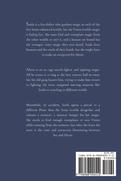 Saida is a fox-shifter who gardens magic in each of the five Sense-enhanced worlds, but the Vision world's magic is fading fast. She must find and transplant magic from the other worlds to save it, and a human on Sound has the strongest voice magic she's ever heard. Saida fears humans and the touch of their hands, but she might have to make an exception for Alesio. Alesio is an ex cage match fighter and aspiring singer. All he wants is to sing at the best concert hall in town, but his old gang haunts him, trying to make him return to fighting, and his partial deafness makes him doubt his dream. He never imagined meeting someone like Saida or traveling to different worlds. Meanwhile, by accident, Saida opens a portal to a different Plane than the Sense worlds altogether and releases a monster: a monster hungry for her magic. She needs to find enough transplants to save Vision while running from the monster; but what she fears the most is the trust and attraction blossoming between her and Alesio.