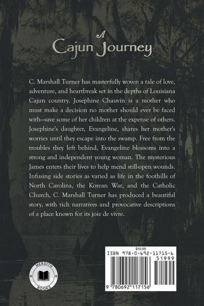 C. Marshall Turner has masterfully woven a tale of love, adventure, and heartbreak set in the depths of Louisiana Cajun country. Josephine Chauvin is a mother who must make a decision no mother should ever be faced with---save some of her children at the expense of others. Josephine's daughter, Evangeline, shares her mother's worries until they escape into the swamp. Free from the troubles they left behind, Evangeline blossoms into a strong and independent young woman. The mysterious James enters their lives to help mend still-open wounds. Infusing side stories as varied as life in the foothills of North Carolina, the Korean War, and the Catholic Church, C. Marshall Turner has produced a beautiful story, with rich narratives and provocative descriptions of a place known for its joie de vivre.