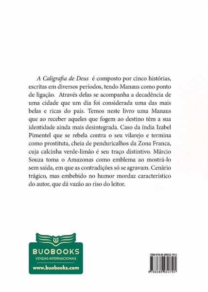 A Caligrafia de Deus é composto por cinco histórias, escritas em diversos períodos, tendo Manaus como ponto de ligação. Através delas se acompanha a decadência de uma cidade que um dia foi considerada uma das mais belas e ricas do país. Temos neste livro uma Manaus que ao receber aqueles que fogem ao destino têm a sua identidade ainda mais desintegrada. Caso da índia Izabel Pimentel que se rebela contra o seu vilarejo e termina como prostituta, cheia de penduricalhos na Zona Franca, cuja calcinha verde-limão é seu traço distintivo. Márcio Souza toma o Amazonas como emblema ao mostrá-lo sem saída, em que as contradições só se agravam. Cenário trágico, mas embebido no humor mordaz característico do autor, que dá vazão ao riso do leitor.