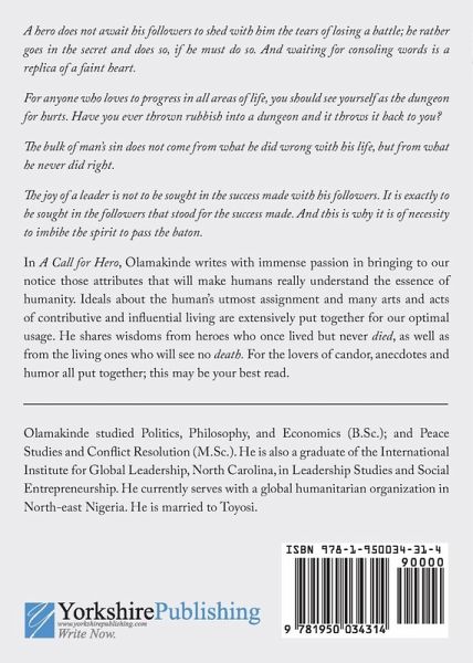 In A Call for Hero, Olamakinde writes with immense passion in bringing to our notice those attributes that will make humans really understand the essence of humanity. Ideals about the human's utmost assignment and many arts and acts of contributive and influential living are extensively put together for our optimal usage. He shares wisdoms from heroes who once lived but never died, as well as from the living ones who will see no death. For the lovers of candor, anecdotes and humor all put together; this may be your best read.
