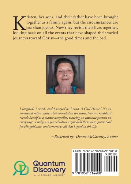 Kristen, her sons, and their father have been brought together as a family again, but the circumstances are less than joyous. Now they revisit their lives together, looking back on all the events that have shaped their varied journeys toward Christ-the good times and the bad. I laughed, I cried, and I prayed as I read 'A Call Home.' It's an emotional roller coaster that overwhelms the senses. Vanessa Goddard reveals herself as a master storyteller, weaving an intricate pattern on every page. Find joy in your children as you hold them close, praise God for His guidance, and remember all that is good in this life. -Reviewed by -Donna McCartney, Author