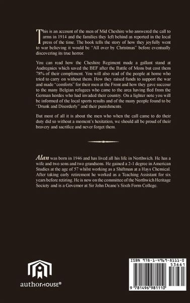 This is an account of the men of Mid Cheshire who answered the call to arms in 1914 and the families they left behind as reported in the local press of the time. The book tells the story of how they joyfully went to war believing it would be "All over by Christmas" before eventually discovering its true horror. You can read how the Cheshire Regiment made a gallant stand at Audregnies which saved the BEF after the Battle of Mons but cost them 78% of their compliment. You will also read of the people at home who tried to carry on without them. How they raised funds to support the war and made "comforts" for their men at the Front and how they gave succour to the many Belgian refugees who came to the area having fled from the German hordes who had invaded their country. On a lighter note you will be informed of the local sports results and of the many people found to be "Drunk and Disorderly" and their punishments. But most of all it is about the men who when the call came to do their duty did so without a moment's hesitation, we should all be proud of their bravery and sacrifice and never forget them.