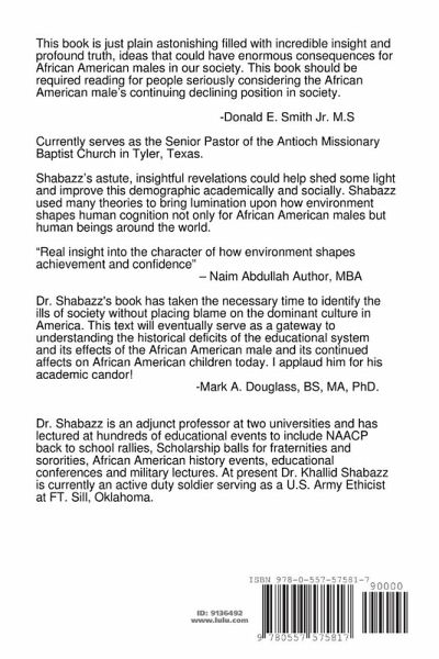 The purpose of this book is to examine the theoretical proposition from Bandura's (1986) Theory of Learning that environment and ethnicity and gender make a difference to the measures of locus of control, self efficacy, and self esteem. No prior studies have examined these relationships specific to the African-American male adult population in a highly structured environment. This study examines the veracity of a foundational principle of Bandura's Theory of Learning as applied to African-American males. This study will include multidisciplinary approaches seeking a way to educate our African American boys. The population will look at public schools, charter schools, military students along with the Afrocentric vs. non Afrocentric approach to education and its effects on this population.
