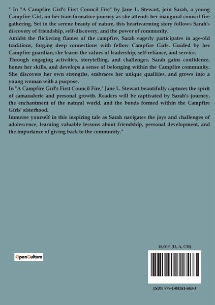 " In "A Campfire Girl's First Council Fire" by Jane L. Stewart, join Sarah, a young Campfire Girl, on her transformative journey as she attends her inaugural council fire gathering. Set in the serene beauty of nature, this heartwarming story follows Sarah's discovery of friendship, self-discovery, and the power of community. Amidst the flickering flames of the campfire, Sarah eagerly participates in age-old traditions, forging deep connections with fellow Campfire Girls. Guided by her Campfire guardian, she learns the values of leadership, self-reliance, and service. Through engaging activities, storytelling, and challenges, Sarah gains confidence, hones her skills, and develops a sense of belonging within the Campfire community. She discovers her own strengths, embraces her unique qualities, and grows into a young woman with a purpose. In "A Campfire Girl's First Council Fire," Jane L. Stewart beautifully captures the spirit of camaraderie and personal growth. Readers will be captivated by Sarah's journey, the enchantment of the natural world, and the bonds formed within the Campfire Girls' sisterhood. Immerse yourself in this inspiring tale as Sarah navigates the joys and challenges of adolescence, learning valuable lessons about friendship, personal development, and the importance of giving back to the community."