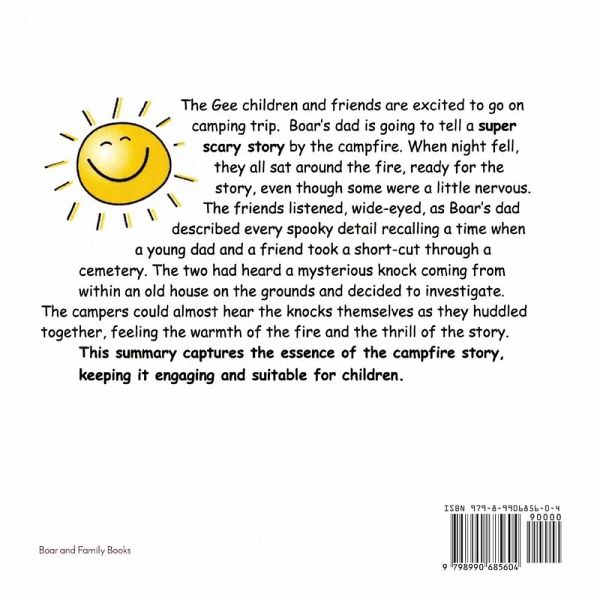 The Gee children and friends are excited to go on a camping trip. Boar's dad is going to tell a super scary story by the campfire. When night fell, they all sat around the fire, ready for the story, even though some were a little nervous. The friends listened, wide-eyed, as Boar's dad described every spooky detail recalling a time when a young dad and a friend took a short-cut through a cemetery. The two had heard a mysterious knock coming from within an old house on the grounds and decided to investigate. The campers could almost hear the knocks themselves as they huddled together, feeling the warmth of the fire and the thrill of the story. This summary captures the essence of the campfire story, keeping it engaging and suitable for children.