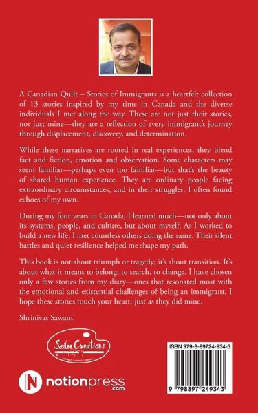 A Canadian Quilt - Stories of Immigrants is a heartfelt collection of 13 stories inspired by my time in Canada and the diverse individuals I met along the way. These are not just their stories, nor just mine-they are a reflection of every immigrant's journey through displacement, discovery, and determination. While these narratives are rooted in real experiences, they blend fact and fiction, emotion and observation. Some characters may seem familiar-perhaps even too familiar-but that's the beauty of shared human experience. They are ordinary people facing extraordinary circumstances, and in their struggles, I often found echoes of my own. During my four years in Canada, I learned much-not only about its systems, people, and culture, but about myself. As I worked to build a new life, I met countless others doing the same. Their silent battles and quiet resilience helped me shape my path. This book is not about triumph or tragedy; it's about transition. It's about what it means to belong, to search, to change. I have chosen only a few stories from my diary-ones that resonated most with the emotional and existential challenges of being an immigrant. I hope these stories touch your heart, just as they did mine. Shrinivas Sawant